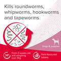 - KILLS ALL TYPES OF COMMON INTESTINAL WORM FOUND IN DOGS LIVING IN THE UK: Kills roundworms, whipworms, hookworms and tapeworms. Routine treatment is essential to help keep infestations away from your dog and family.