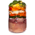 chicken 35% (chicken stomach 16%, chicken heart 11%, chicken muscle meat 8%), broth 34%, cucumber 6%, carrot 6%, pumpkin 6%, broccoli 3%, pineapple 2%, cellulose 2% *, lupin meal 2% *, parsnip 1% *, minerals 1% *, fennel, coconut flour *, artichoke leaf *, psyllium husks *, psyllium seed *, dandelion *, marigold *, yarrow *, basil *, brewer’s yeast *, chia seed *, oyster shell *, spirulina * *dried